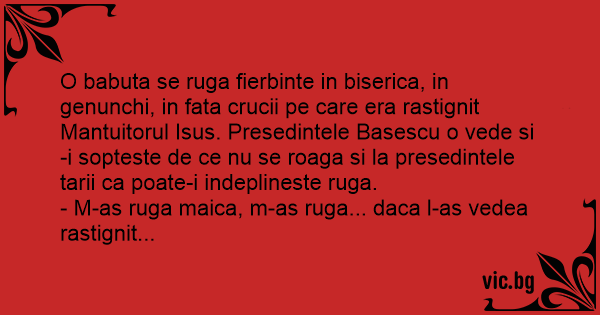 O babuta se ruga fierbinte in biserica, in genunchi, in fata crucii pe care era rastignit Mantuitorul Isus. Presedintele Basescu o vede si-i sopteste de ce nu se roaga si la presedintele tarii ca poate-i indeplineste ruga.