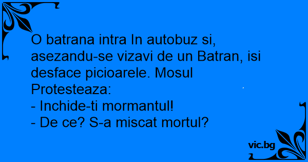 O batrana intra In autobuz si, asezandu-se vizavi de un Batran, isi desface picioarele. Mosul Protesteaza: