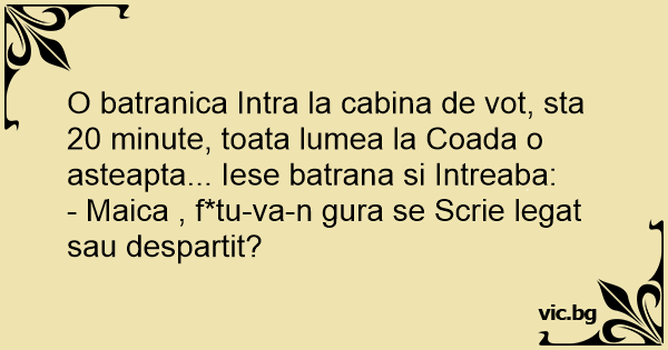 O batranica Intra la cabina de vot, sta 20 minute, toata lumea la Coada o asteapta... Iese batrana si Intreaba: