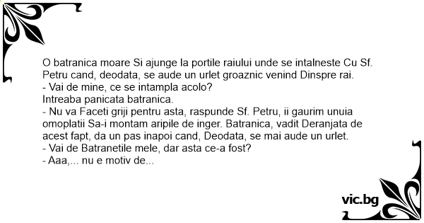 - Nu va Faceti griji pentru asta, raspunde Sf. Petru, ii gaurim unuia omoplatii Sa-i montam aripile de inger. Batranica, vadit Deranjata de acest fapt, da un pas inapoi cand, Deodata, se mai aude un urlet.