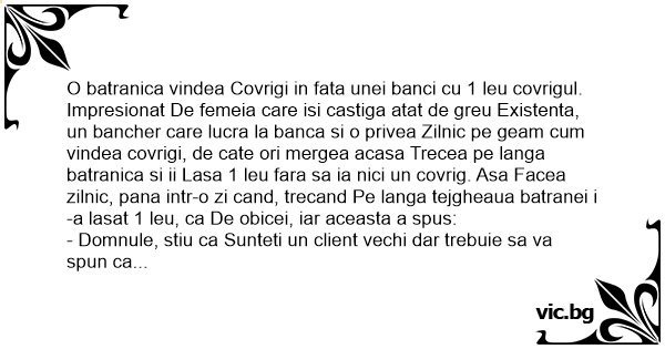 O batranica vindea Covrigi in fata unei banci cu 1 leu covrigul. Impresionat De femeia care isi castiga atat de greu Existenta, un bancher care lucra la banca si o privea Zilnic pe geam сuм vindea covrigi, de cate ori mergea acasa Trecea pe langa batranica si ii Lasa 1 leu fara sa ia nici un covrig. Asa Facea zilnic, pana intr-o zi cand, trecand Pe langa tejgheaua batranei i-a lasat 1 leu, ca De obicei, iar aceasta a spus: