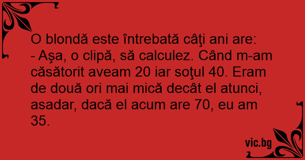 - Aşa, o clipă, să calculez. Când m-am căsătorit aveam 20 iar soţul 40. Eram de două ori mai mică decât el atunci, asadar, dacă el acum are 70, eu am 35.