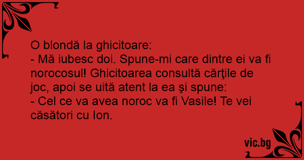 - Mă iubesc doi. Spune-mi care dintre ei va fi norocosul! Ghicitoarea consultă cărţile de joc, apoi se uită atent la ea şi spune: