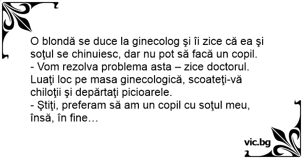 O blondă se duce la ginecolog şi îi zice că ea şi soţul se chinuiesc, dar nu рот să facă un copil.