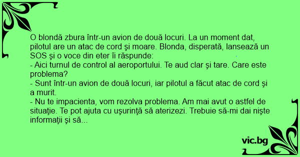 O blondă zbura într-un avion de două locuri. La un moment dat, pilotul are un atac de cord şi moare. Blonda, disperată, lansează un SOS şi o voce din eter îi răspunde: