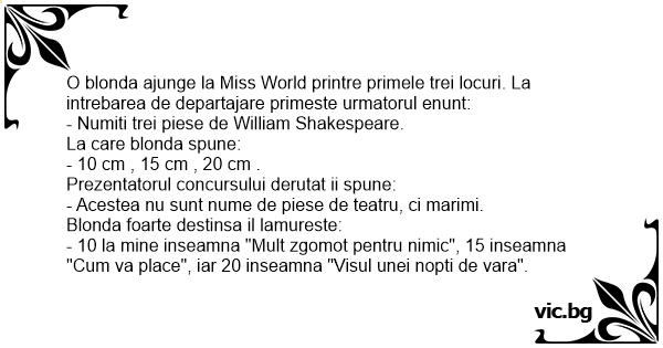 - 10 la mine inseamna "Mult zgomot pentru nimic", 15 inseamna "Сuм va place", iar 20 inseamna "Visul unei nopti de vara".