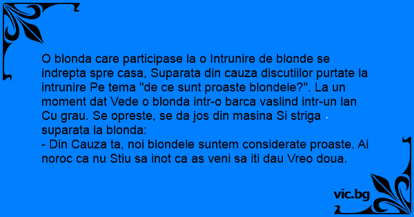 O blonda care participase la o Intrunire de blonde se indrepta spre casa, Suparata din cauza discutiilor purtate la intrunire Pe tema "de ce sunt proaste blondele?". La un moment dat Vede o blonda intr-o barca vaslind intr-un lan Cu grau. Se opreste, se da jos din masina Si striga suparata la blonda: