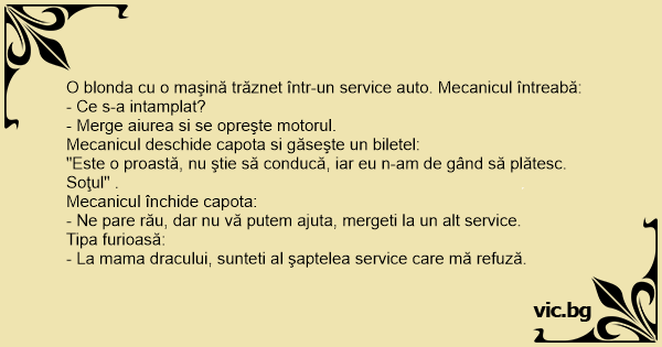 O blonda cu o maşină trăznet într-un service auto. Mecanicul întreabă: