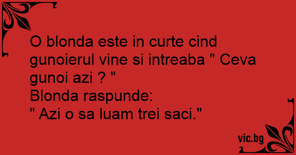 O blonda este in curte cind gunoierul vine si intreaba " Ceva gunoi azi ? " Blonda raspunde: " Azi o sa luam trei saci."