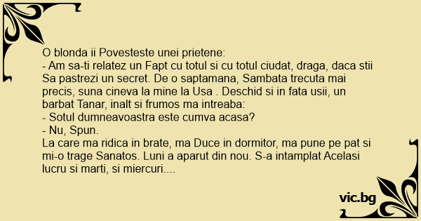 - Am sa-ti relatez un Fapt cu totul si cu totul ciudat, draga, daca stii Sa pastrezi un secret. De o saptamana, Sambata trecuta mai precis, suna cineva la mine la Usa . Deschid si in fata usii, un barbat Tanar, inalt si frumos ma intreaba: