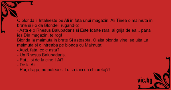 Blonda ia maimuta in brate Si asteapta. O alta blonda vine, se uita La maimuta si o intreaba pe blonda cu Maimuta: