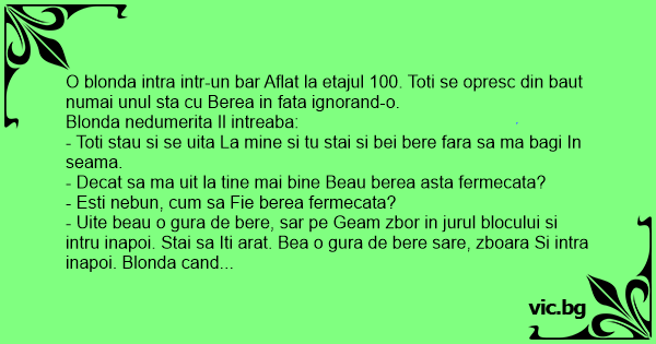- Uite beau o gura de bere, sar pe Geam zbor in jurul blocului si intru inapoi. Stai sa Iti arat. Bea o gura de bere sare, zboara Si intra inapoi. Blonda cand vede striga la Barman: