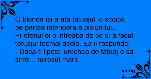O blonda isi arata tatuajul, o scoica, pe partea interioara a piciorului... Prietenul ei o intreaba de ce si-a facut tatuajul tocmai acolo. Ea ii raspunde: