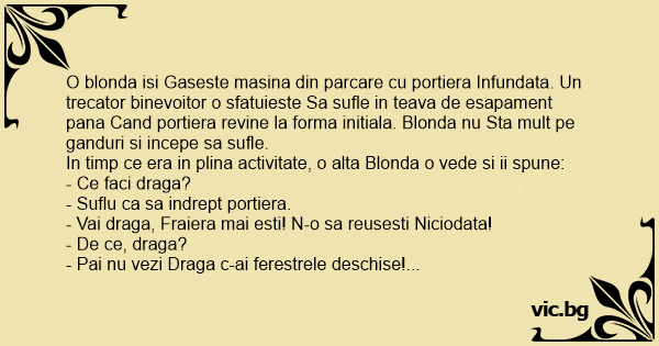 Egy szőke nő behorpasztja az autója oldalát. Elviszi a szervizbe, ahol a karosszériás (mivel látja, hogy egy szőkével van dolga) poénból azt mondja neki, hogy jó erősen fújjon bele a kipufogóba és...
