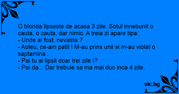O blonda lipseste de acasa 3 zile. Sotul innebunit o cauta, o cauta, dar nimic. A treia zi apare tipa: