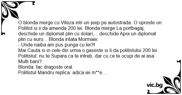 O blonda merge cu Viteza intr-un jeep pe autostrada. O opreste un Politist si ii da amenda 200 lei. Blonda merge La portbagaj, deschide un diplomat plin cu dolari,... deschide Apoi un diplomat plin cu euro... Blonda iritata Mormaie: