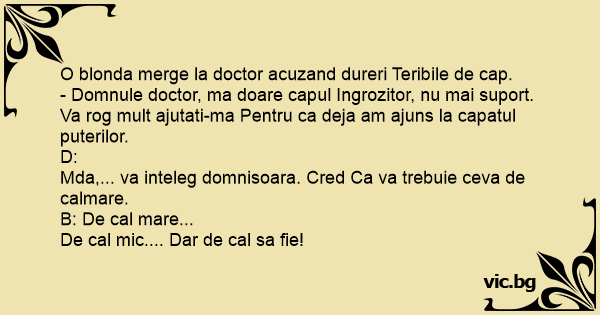 - Domnule doctor, ma doare capul Ingrozitor, nu mai suport. Va rog mult ajutati-ma Pentru ca deja am ajuns la capatul puterilor.