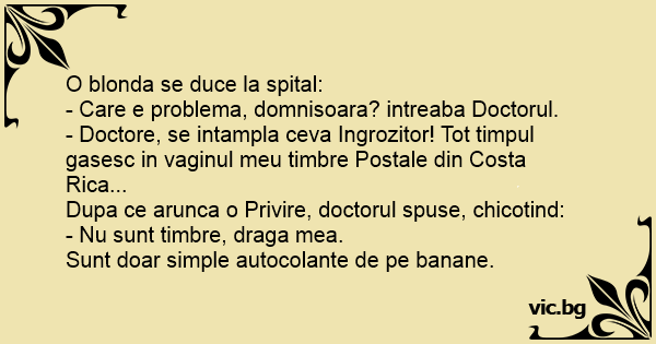 - Doctore, se intampla ceva Ingrozitor! Tot timpul gasesc in vaginul meu timbre Postale din Costa Rica...