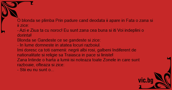 O blonda se plimba Prin padure cand deodata ii apare in Fata o zana si ii zice: