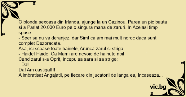 O blonda sexoasa din Irlanda, ajunge la un Cazinou. Parea un pic bauta si a Pariat 20.000 Euro pe o singura mana de zaruri. In Acelasi timp spuse:
