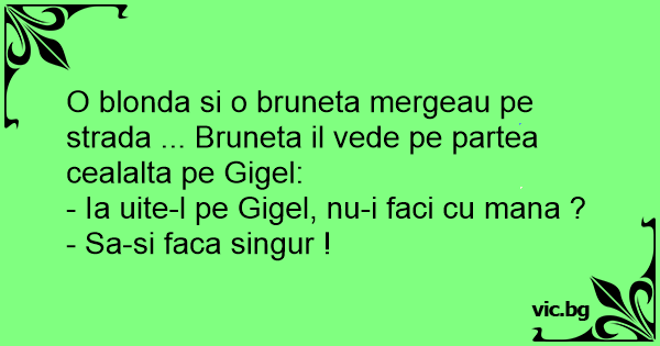 O blonda si o bruneta mergeau pe strada ... Bruneta il vede pe partea cealalta pe Gigel: - Ia uite-l pe Gigel, nu-i faci cu mana ? - Sa-si faca singur !
