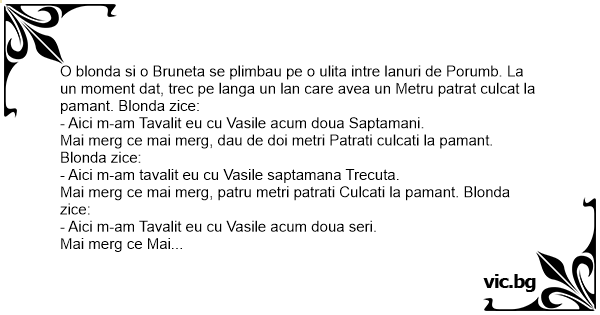 O blonda si o Bruneta se plimbau pe o ulita intre lanuri de Porumb. La un moment dat, trec pe langa un lan care avea un Metru patrat culcat la pamant. Blonda zice: