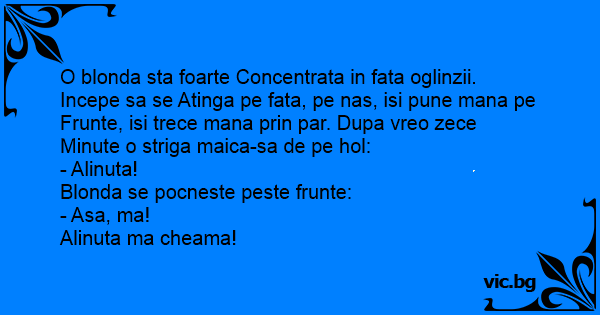 O blonda sta foarte Concentrata in fata oglinzii. Incepe sa se Atinga pe fata, pe nas, isi pune mana pe Frunte, isi trece mana prin par. Dupa vreo zece Minute o striga maica-sa de pe hol:
