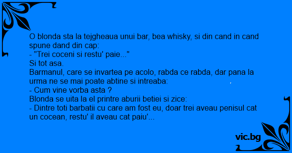 - Dintre toti barbatii cu care am fost eu, doar trei aveau penisul cat un cocean, restu' il aveau cat paiu'...