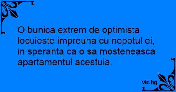 O bunica extrem de optimista locuieste impreuna cu nepotul ei, in speranta ca o sa mosteneasca apartamentul acestuia.