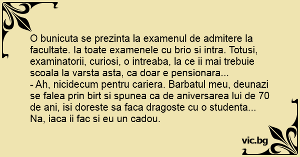 O bunicuta se prezinta la examenul de admitere la facultate. Ia toate examenele cu brio si intra. Totusi, examinatorii, curiosi, o intreaba, la ce ii mai trebuie scoala la varsta asta, ca doar e pensionara...