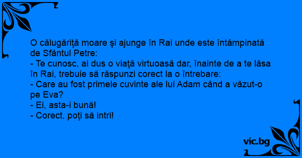 - Te cunosc, ai dus o viaţă virtuoasă dar, înainte de a te lăsa în Rai, trebuie să răspunzi corect la o întrebare: