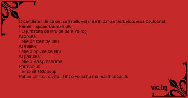 O cantitate Infinita de matimaticieni intra in bar sa Sarbatoreasca doctoratul. Primul ii spune Barman-ului: