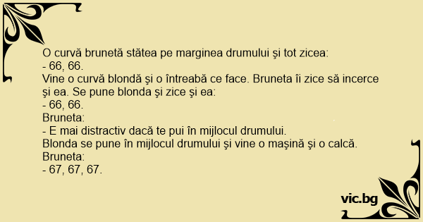 Vine o curvă blondă şi o întreabă ce face. Bruneta îi zice să incerce şi ea. Se pune blonda şi zice şi ea: