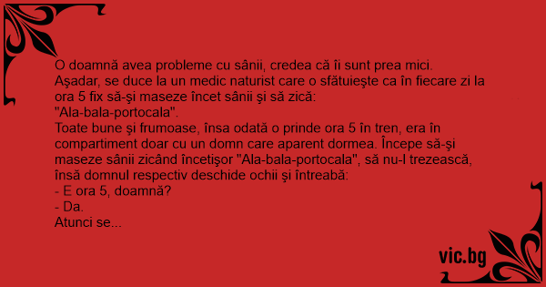 Toate bune şi frumoase, însa odată o prinde ora 5 în tren, era în compartiment doar cu un domn care aparent dormea. Începe să-şi maseze sânii zicând încetişor "Ala-bala-portocala", să nu-l trezească, însă domnul respectiv deschide ochii şi întreabă:
