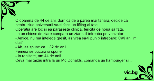 Cu ocazia implinirii a 47 De ani, familia unei doamne ii ofera o programare la Operatie estetica, pentru intinerire. In urma Operatiei, doamna chiar arata mai tanara Si de aceea era foarte...