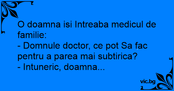 O doamna isi Intreaba medicul de familie:<br />- Domnule doctor, ce рот Sa fac pentru a parea mai subtirica?<br />- Intuneric, doamna...
