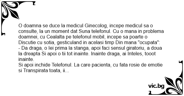 O doamna se duce la medicul Ginecolog, incepe medicul sa o consulte, la un moment dat Suna telefonul. Cu o mana in problema doamnei, cu Cealalta pe telefonul mobil, incepe sa poarte o Discutie cu sotia, gesticuland in acelasi timp Din mana "ocupata":