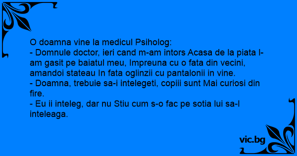 - Domnule doctor, ieri cand m-am intors Acasa de la piata l-am gasit pe baiatul meu, Impreuna cu o fata din vecini, amandoi stateau In fata oglinzii cu pantalonii in vine.