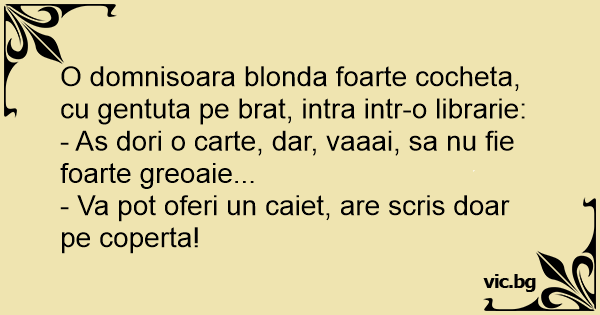 O domnisoara blonda foarte cocheta, cu gentuta pe brat, intra intr-o librarie: