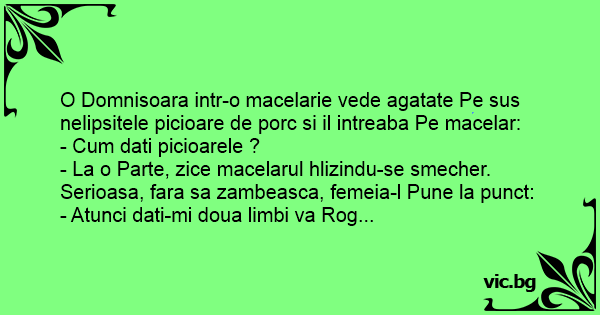 O Domnisoara intr-o macelarie vede agatate Pe sus nelipsitele picioare de porc si il intreaba Pe macelar: