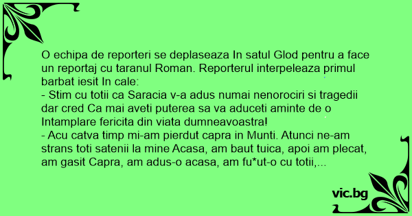 - Acu catva timp mi-am pierdut capra in Munti. Atunci ne-am strans toti satenii la mine Acasa, am baut tuica, apoi am plecat, am gasit Capra, am adus-o acasa, am fu*ut-o cu totii, apoi am baut Iarasi tuica.