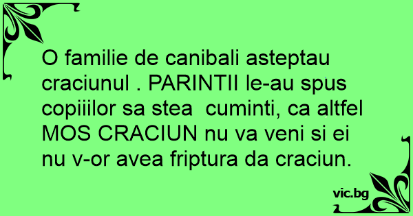 O familie de canibali asteptau craciunul . PARINTII le-au spus copiiilor sa stea cuminti, ca altfel MOS CRACIUN nu va veni si ei nu v-or avea friptura da craciun.