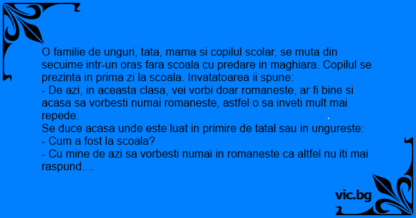 - De azi, in aceasta clasa, vei vorbi doar romaneste, ar fi bine si acasa sa vorbesti numai romaneste, astfel o sa inveti mult mai repede.