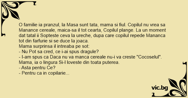 O familie ia pranzul, la Masa sunt tata, mama si fiul. Copilul nu vrea sa Manance cereale, maica-sa il tot cearta, Copilul plange. La un moment dat tatal ii Sopteste ceva la ureche, dupa care copilul repede Mananca tot din farfurie si se duce la joaca.