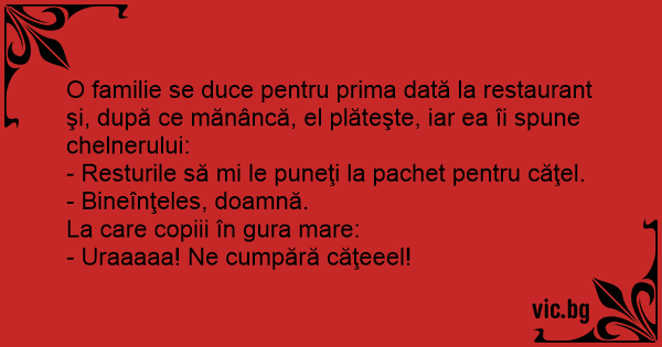 O familie se duce pentru prima dată la restaurant şi, după ce mănâncă, el plăteşte, iar ea îi spune chelnerului: