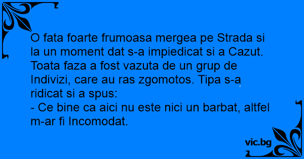 O fata foarte frumoasa mergea pe Strada si la un moment dat s-a impiedicat si a Cazut. Toata faza a fost vazuta de un grup de Indivizi, care au ras zgomotos. Tipa s-a ridicat si a spus: