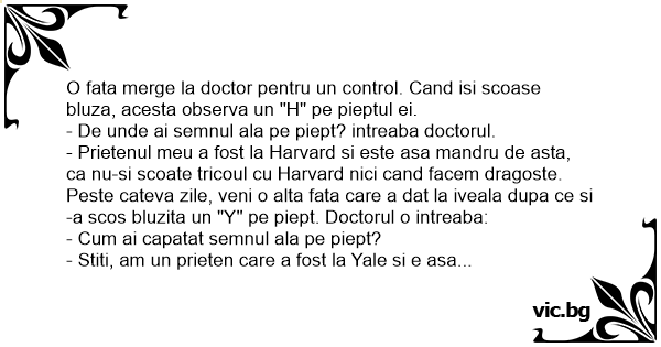 Peste cateva zile, veni o alta fata care a dat la iveala dupa ce si-a scos bluzita un "Y" pe piept. Doctorul o intreaba: