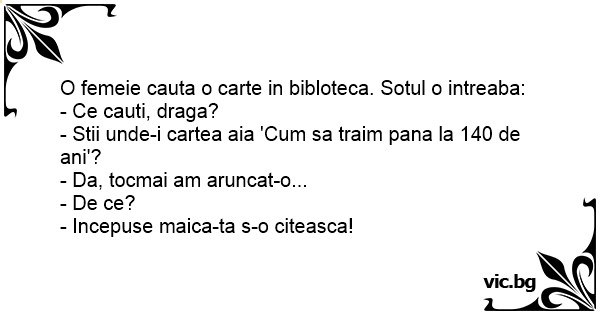 O femeie cauta o carte in bibloteca. Sotul o intreaba: