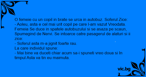 - Aoleu, asta e cel mai urit copil pe care l-am vazut Vreodata. Femeia Se duce in spatele autobuzului si se asaza pe scaun, Spumegind de Nervi. Se intoarce catre pasagerul de alaturi si ii zice: