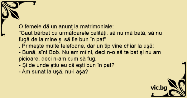 "Caut bărbat cu următoarele calităţi: să nu mă bată, să nu fugă de la mine şi să fie bun în pat"
